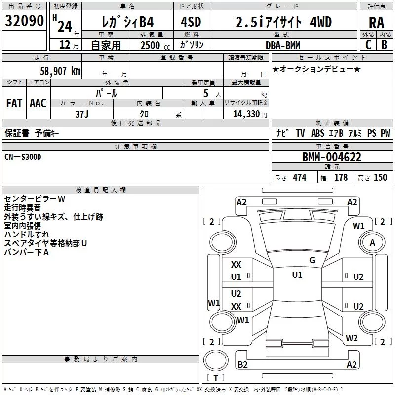 Subaru LEGACY B4 с аукциона Японии TAA Kinki лот № 32090