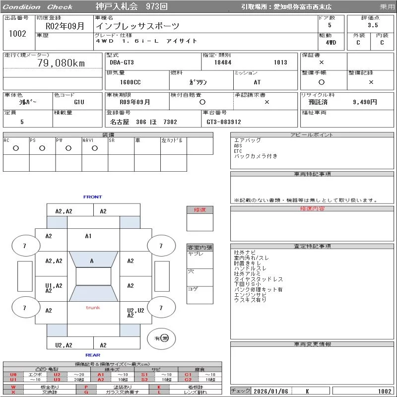 Subaru IMPREZA с аукциона Японии ORIX Kobe Nyusatsu лот № 1002