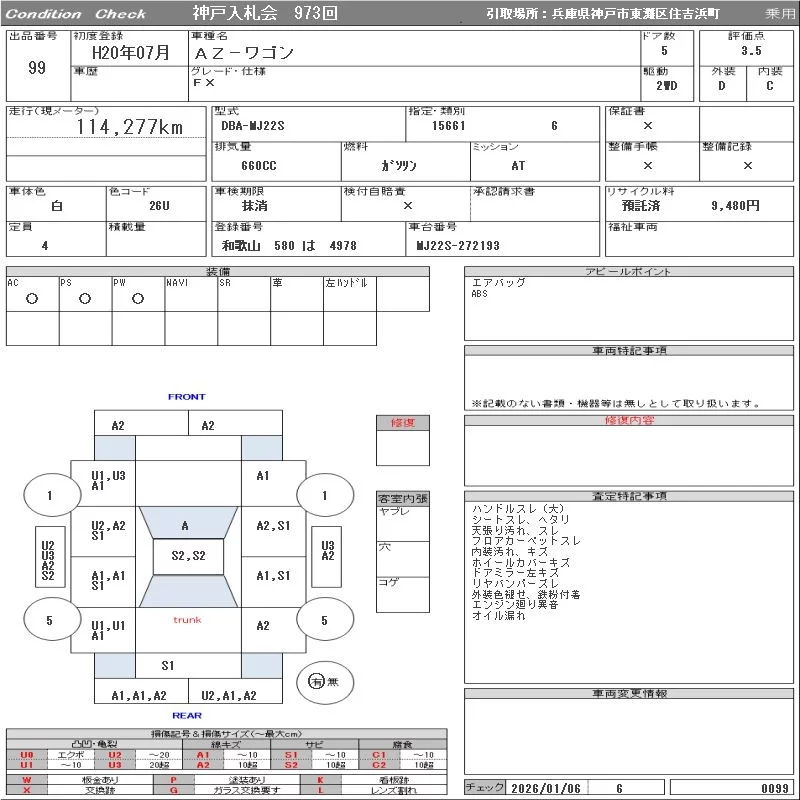 Mazda AZ WAGON с аукциона Японии ORIX Kobe Nyusatsu лот № 99