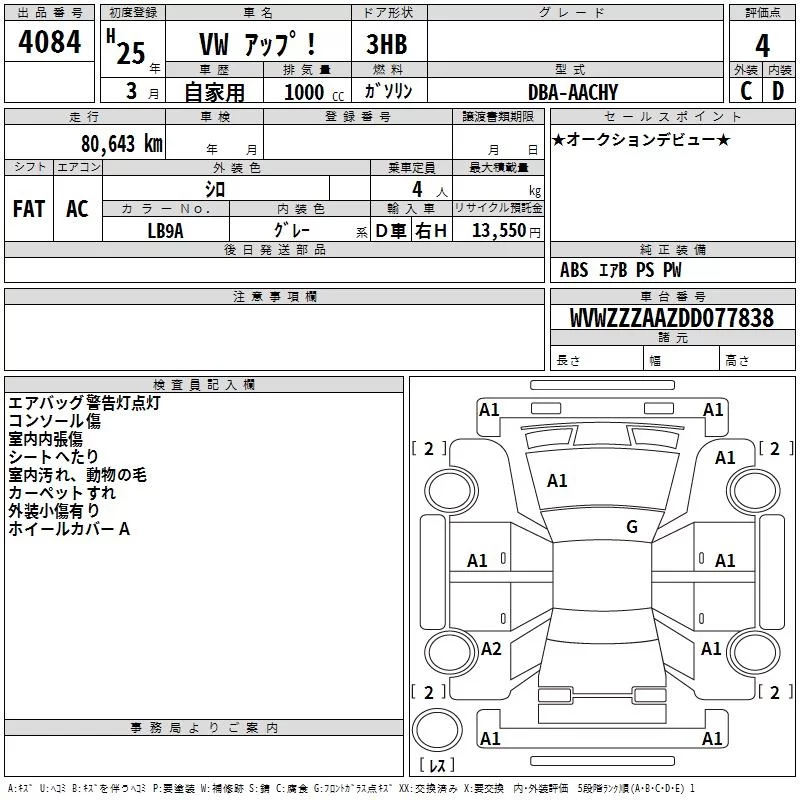 Volkswagen UP с аукциона Японии TAA Kyushu лот № 4084