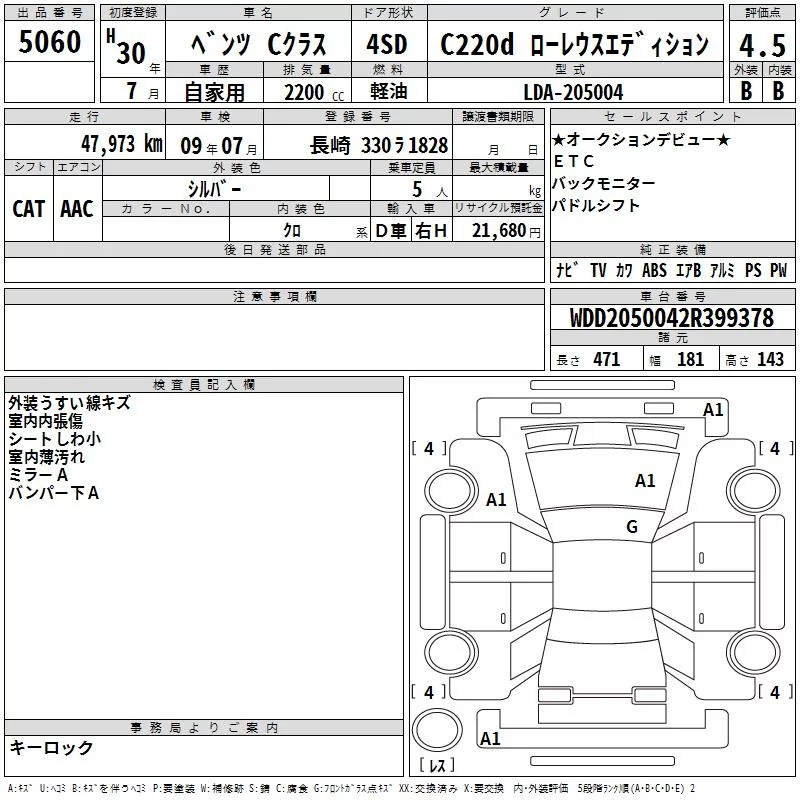 Mercedes-Benz C CLASS с аукциона Японии TAA Kyushu лот № 5060