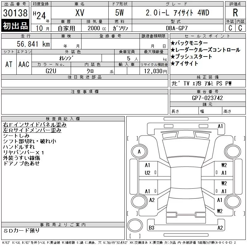 Subaru XV с аукциона Японии CAA Chubu лот № 30138