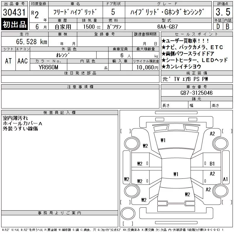 Honda FREED с аукциона Японии CAA Chubu лот № 30431