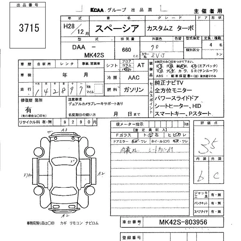 Suzuki SPACIA с аукциона Японии KCAA Minami Kyushu лот № 3715