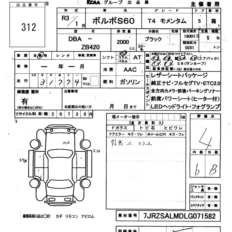 Volvo S60 с аукциона Японии KCAA Minami Kyushu лот № 312