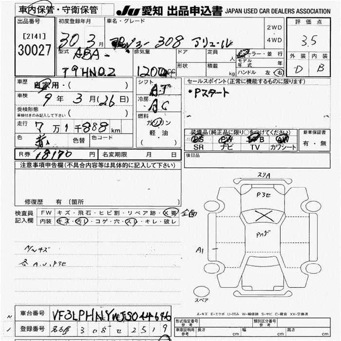 Peugeot 308 с аукциона Японии JU Aichi лот № 30027