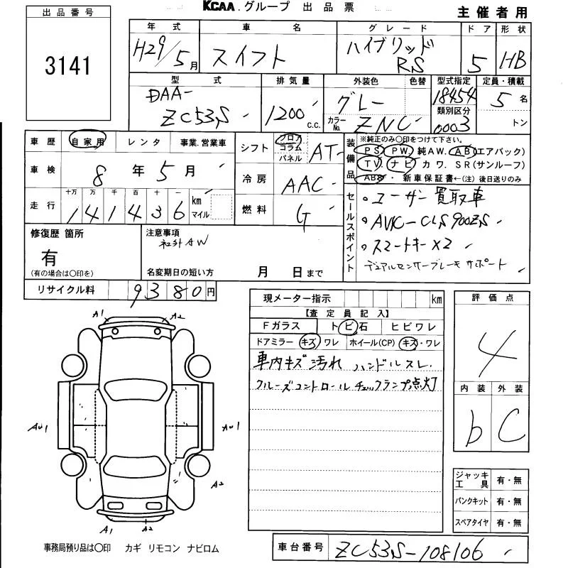 Suzuki SWIFT с аукциона Японии KCAA Fukuoka лот № 3141