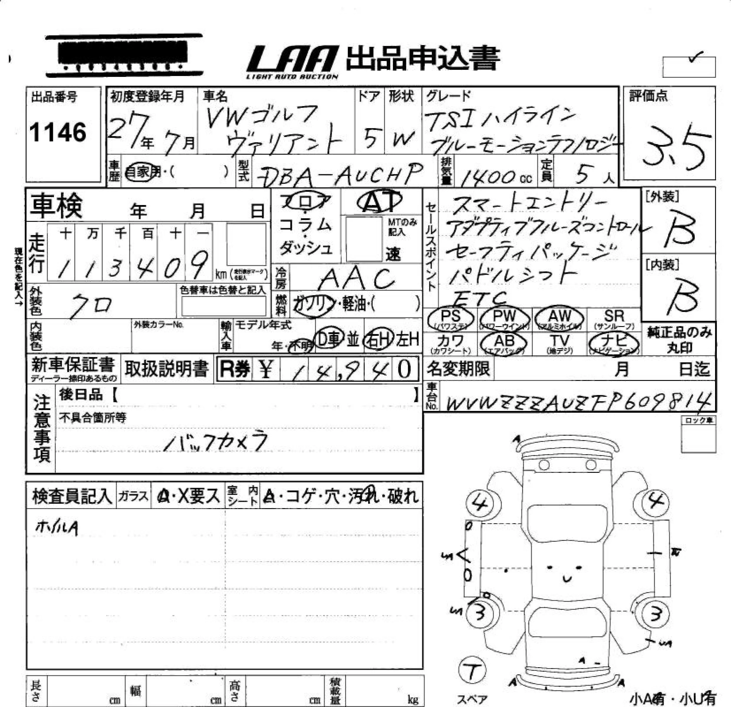 Volkswagen GOLF VARIANT с аукциона Японии LAA Okayama лот № 1146