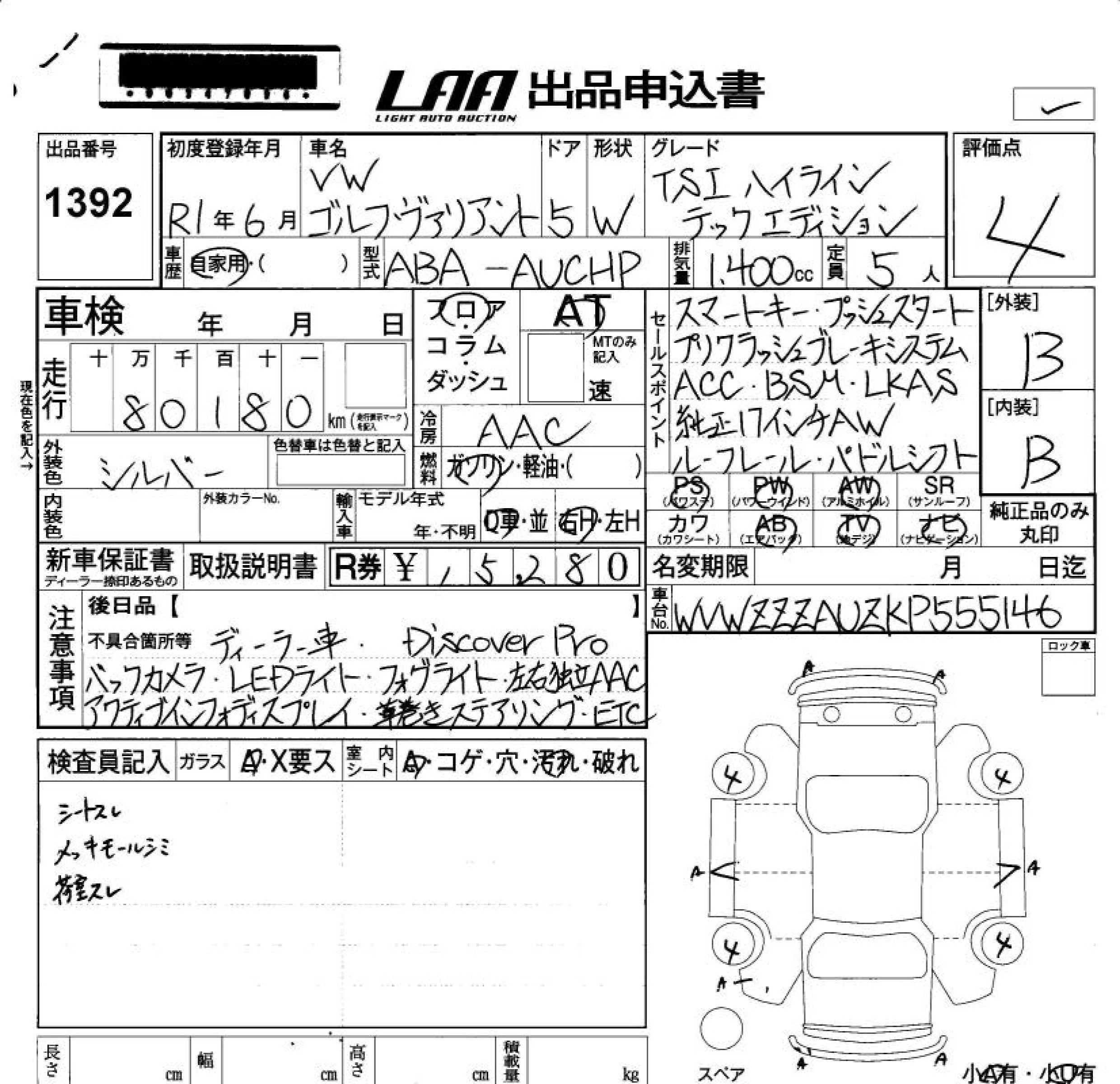 Volkswagen GOLF VARIANT с аукциона Японии LAA Okayama лот № 1392