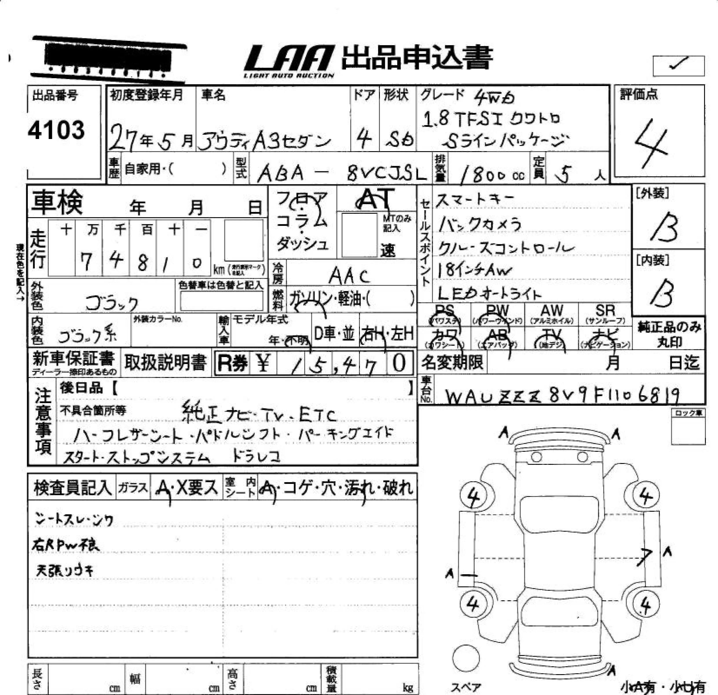 Audi A3 с аукциона Японии LAA Okayama лот № 4103