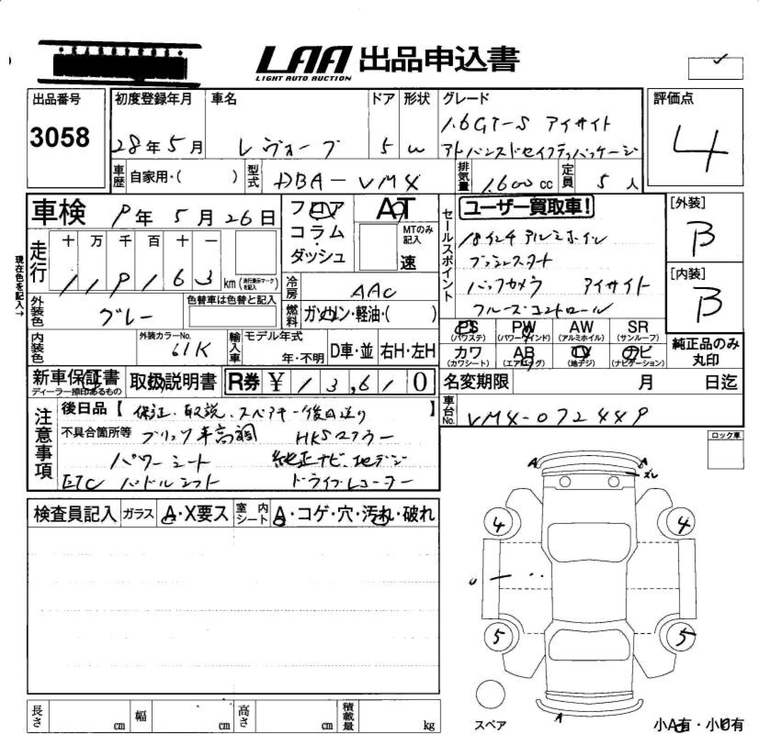 Subaru LEVORG с аукциона Японии LAA Okayama лот № 3058