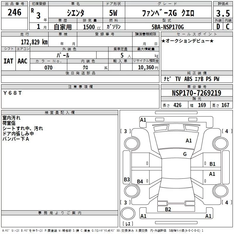 Toyota SIENTA с аукциона Японии TAA Hyogo лот № 246