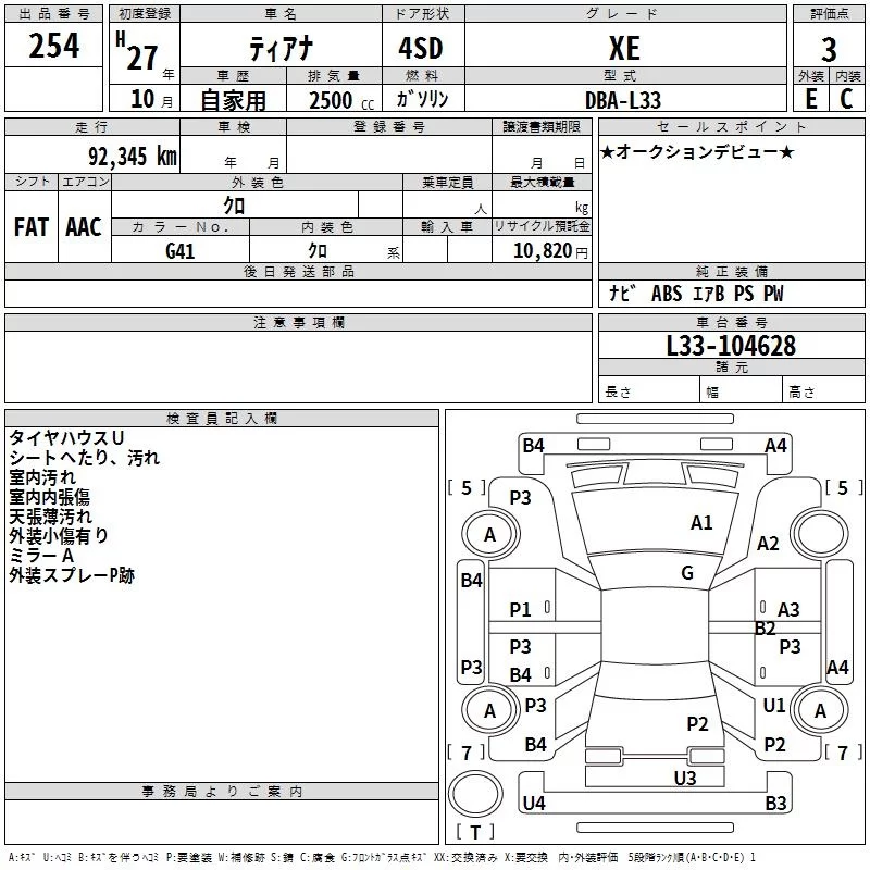 Nissan TEANA с аукциона Японии TAA Hyogo лот № 254
