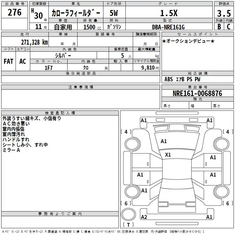 Toyota COROLLA FIELDER с аукциона Японии TAA Hyogo лот № 276