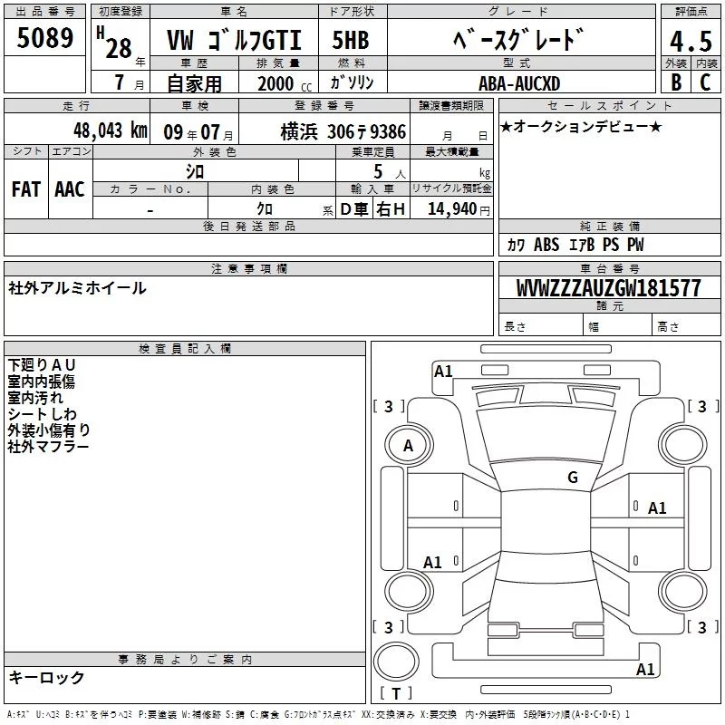 Volkswagen GOLF с аукциона Японии TAA Yokohama лот № 5089