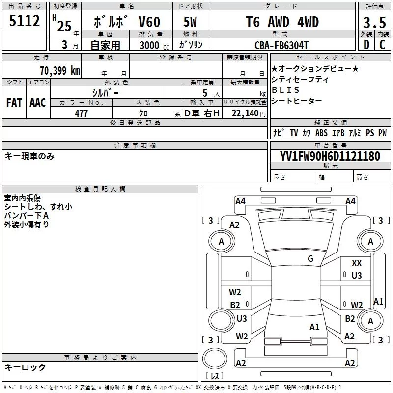 Volvo V60 с аукциона Японии TAA Yokohama лот № 5112