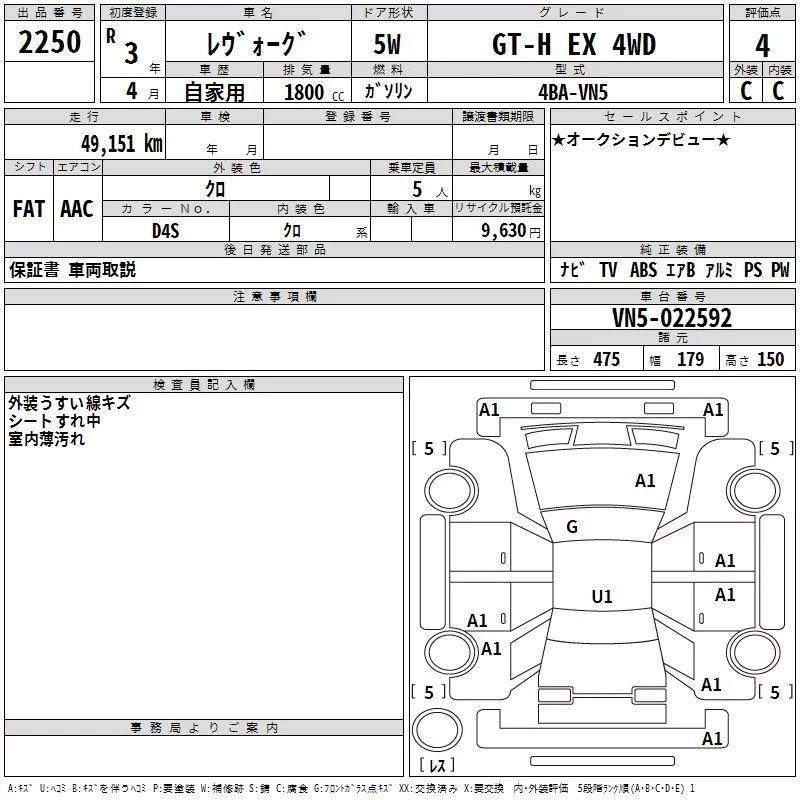 Subaru LEVORG с аукциона Японии TAA Hyogo лот № 2250