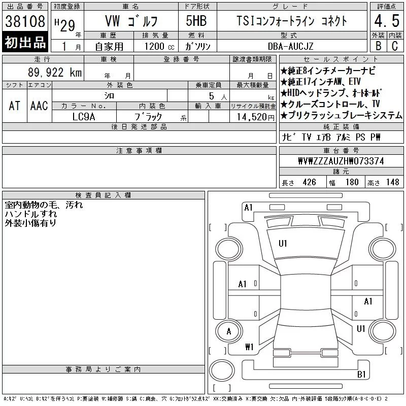 Volkswagen GOLF с аукциона Японии CAA Tokyo лот № 38108