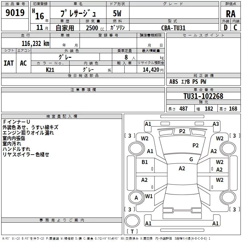 Nissan PRESAGE с аукциона Японии TAA Kyushu лот № 9019