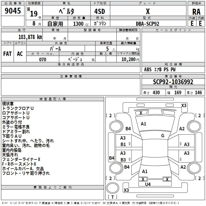 Toyota BELTA с аукциона Японии TAA Kyushu лот № 9045