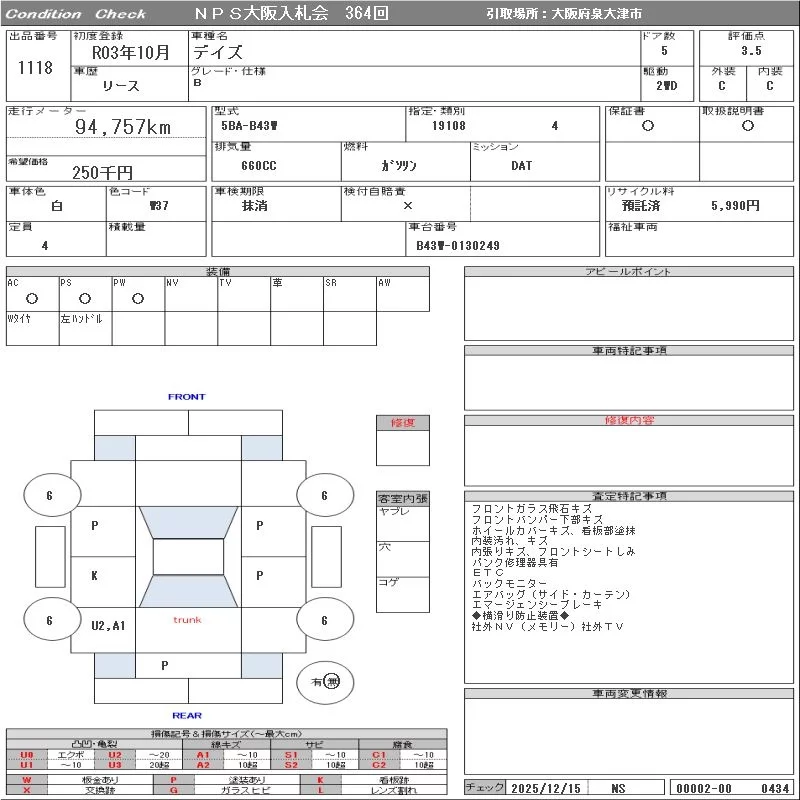 Nissan DAYZ с аукциона Японии NPS Osaka Nyusatsu лот № 1118