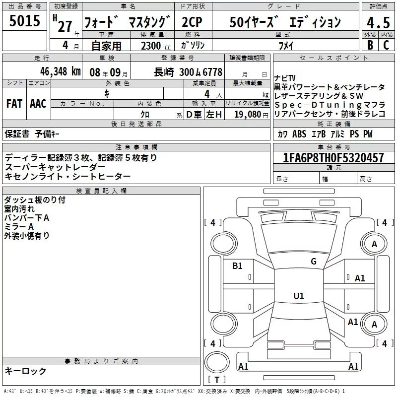 Ford MUSTANG с аукциона Японии TAA Kyushu лот № 5015