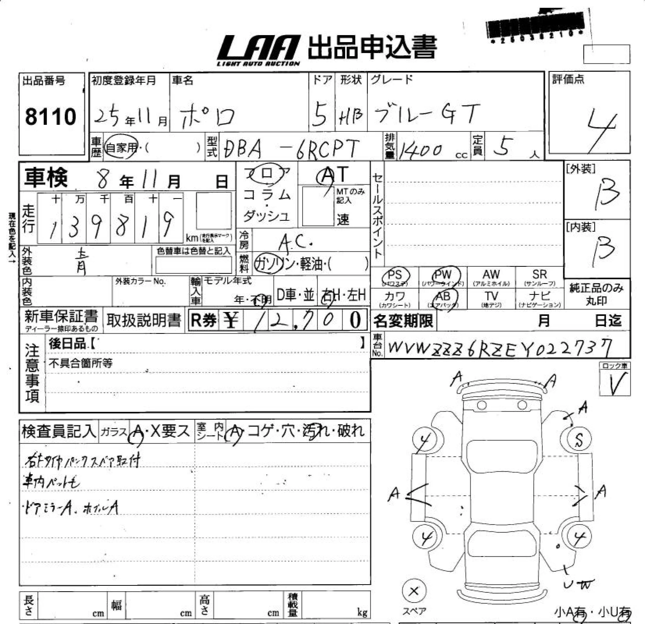 Volkswagen POLO с аукциона Японии LAA Shikoku лот № 8110