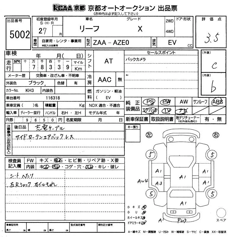 Nissan LEAF с аукциона Японии KCAA Kyoto лот № 5002