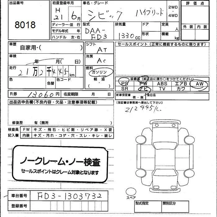 Honda CIVIC HYBRID с аукциона Японии JU Kumamoto лот № 8018