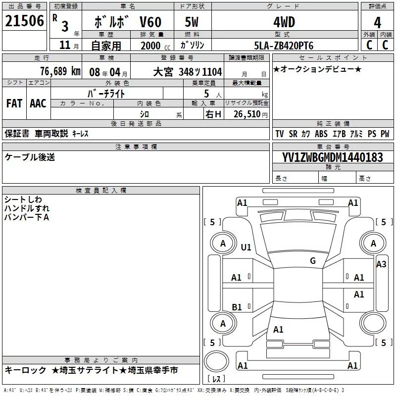 Volvo V60 с аукциона Японии TAA Kanto лот № 21506