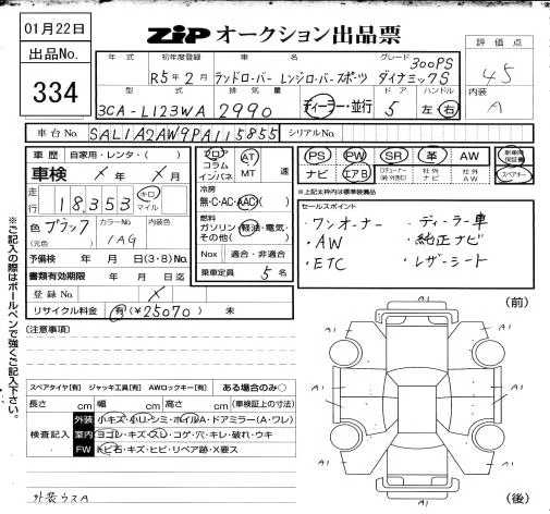 Rover RANGE ROVER с аукциона Японии ZIP Osaka лот № 334