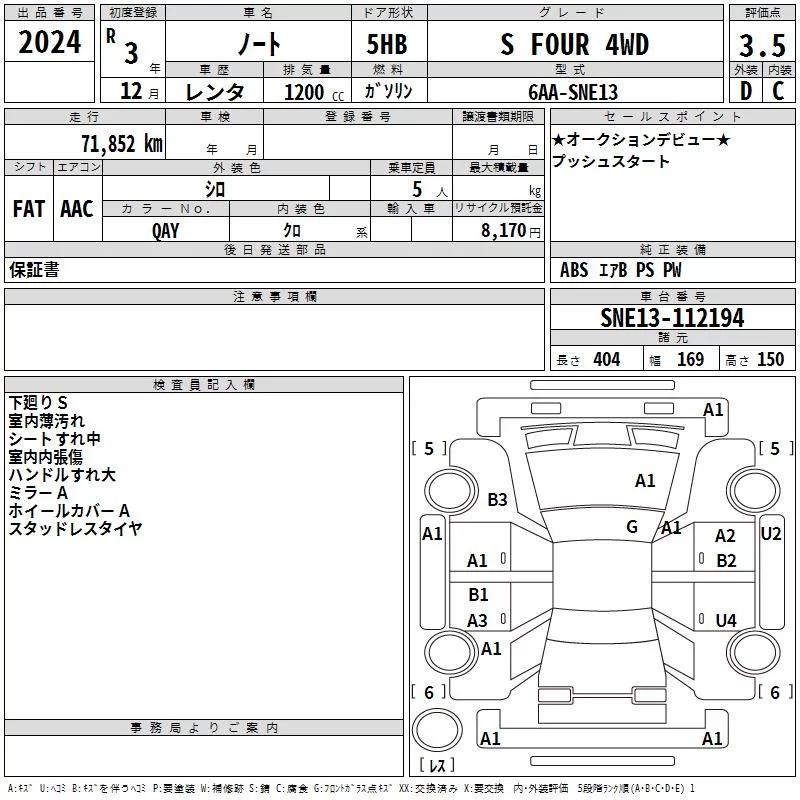 Nissan NOTE с аукциона Японии TAA Hokkaido лот № 2024