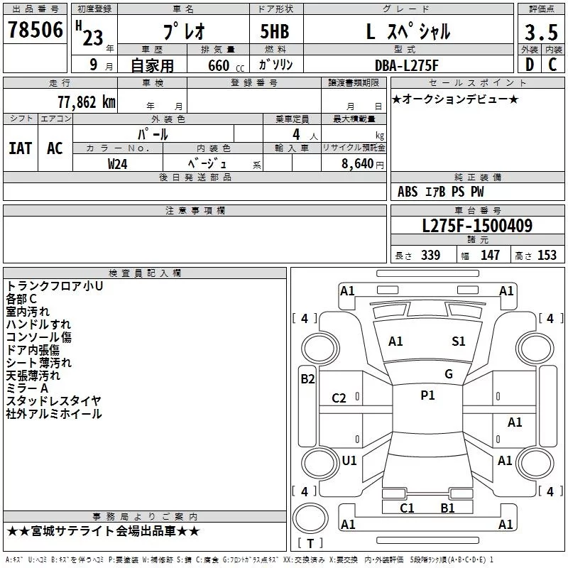 Subaru PLEO с аукциона Японии TAA Tohoku лот № 78506