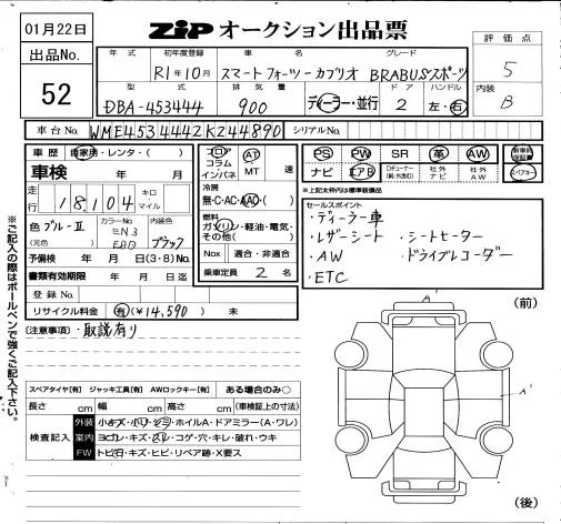 Smart FORTWO с аукциона Японии ZIP Osaka лот № 52