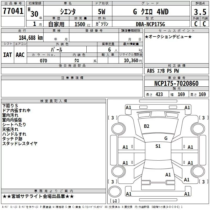 Toyota SIENTA с аукциона Японии TAA Tohoku лот № 77041