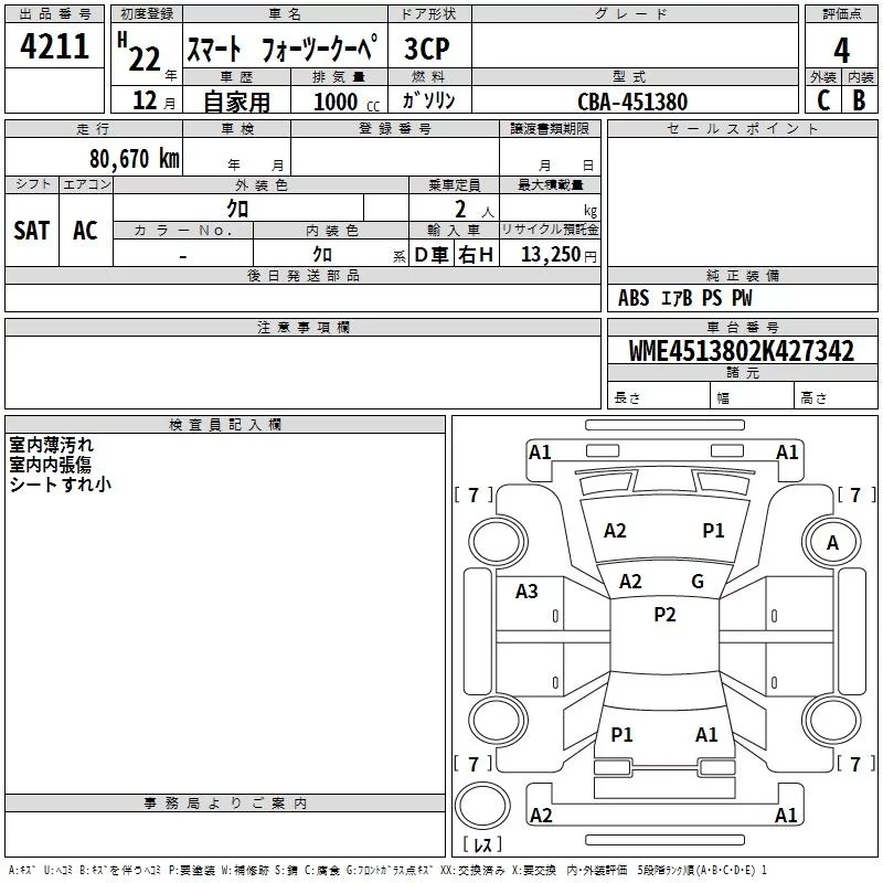 Smart FORTWO с аукциона Японии TAA Chubu лот № 4211