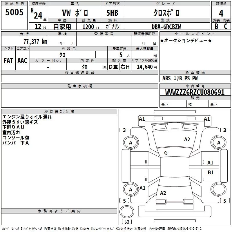 Volkswagen CROSS POLO с аукциона Японии TAA Chubu лот № 5005
