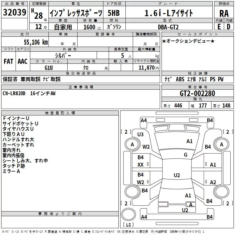 Subaru IMPREZA с аукциона Японии TAA Kanto лот № 32039