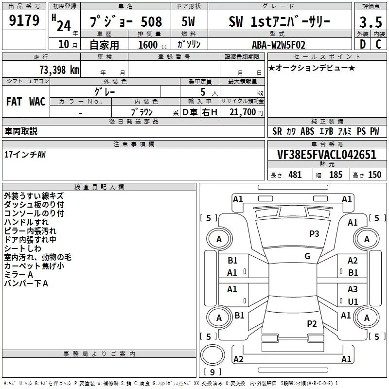 Peugeot 508 с аукциона Японии TAA Kanto лот № 9179