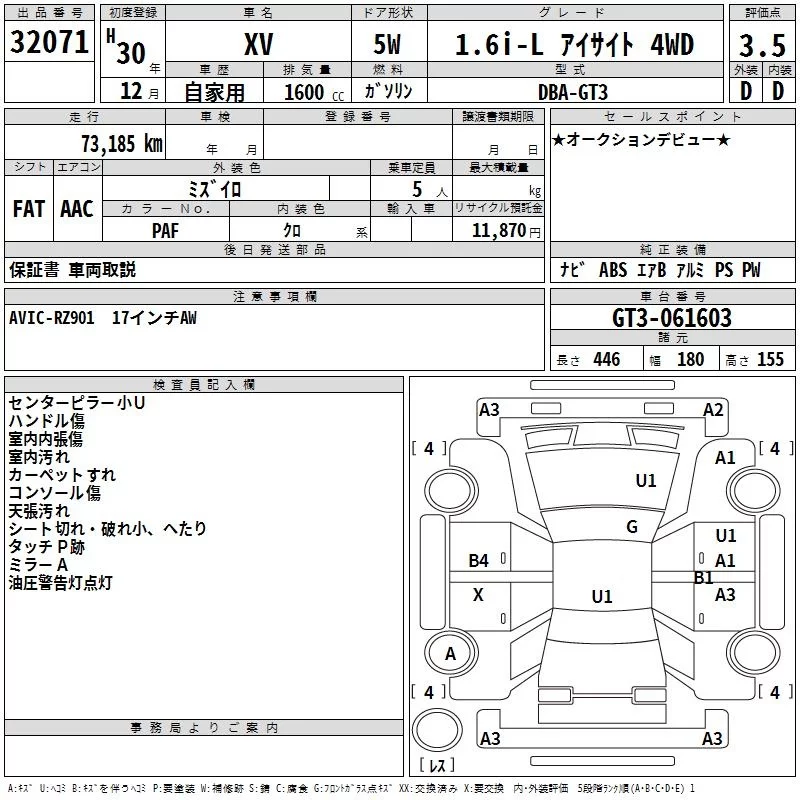 Subaru XV с аукциона Японии TAA Kanto лот № 32071