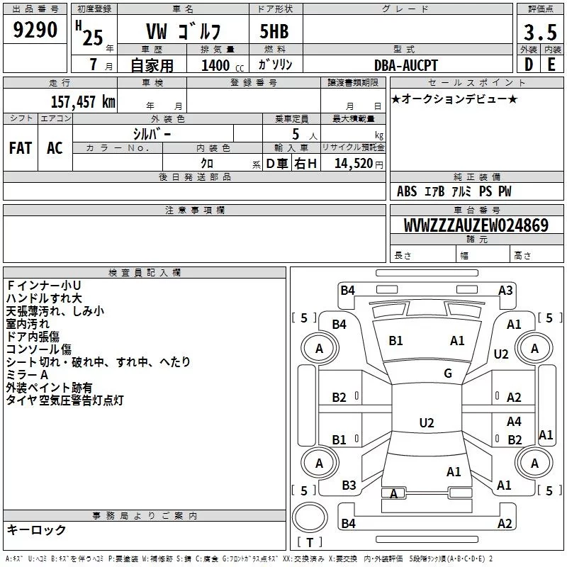 Volkswagen GOLF с аукциона Японии TAA Kanto лот № 9290