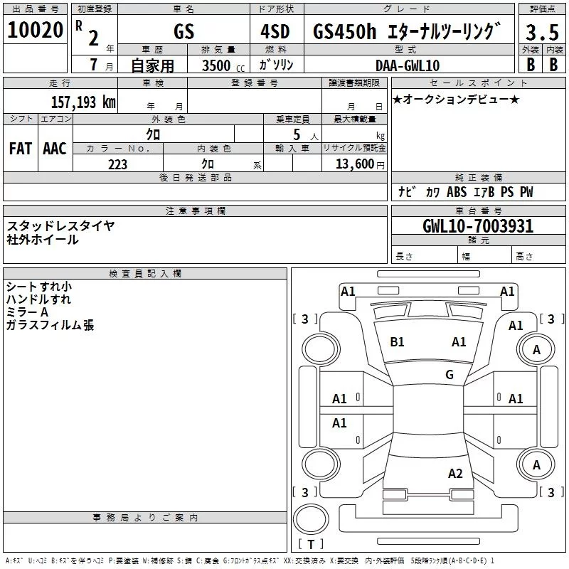 Lexus GS с аукциона Японии TAA Kanto лот № 10020