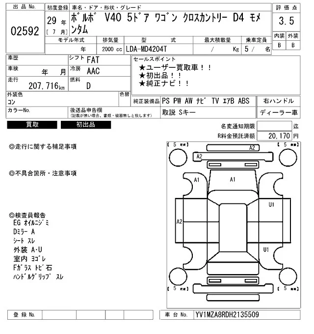 Volvo V40 с аукциона Японии ARAI Bayside лот № 2592