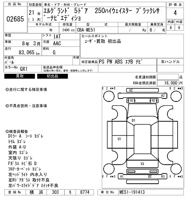 Nissan ELGRAND с аукциона Японии ARAI Bayside лот № 2685