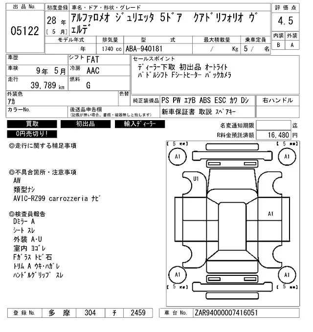 Alfa Romeo Giulietta с аукциона Японии ARAI Bayside лот № 5122