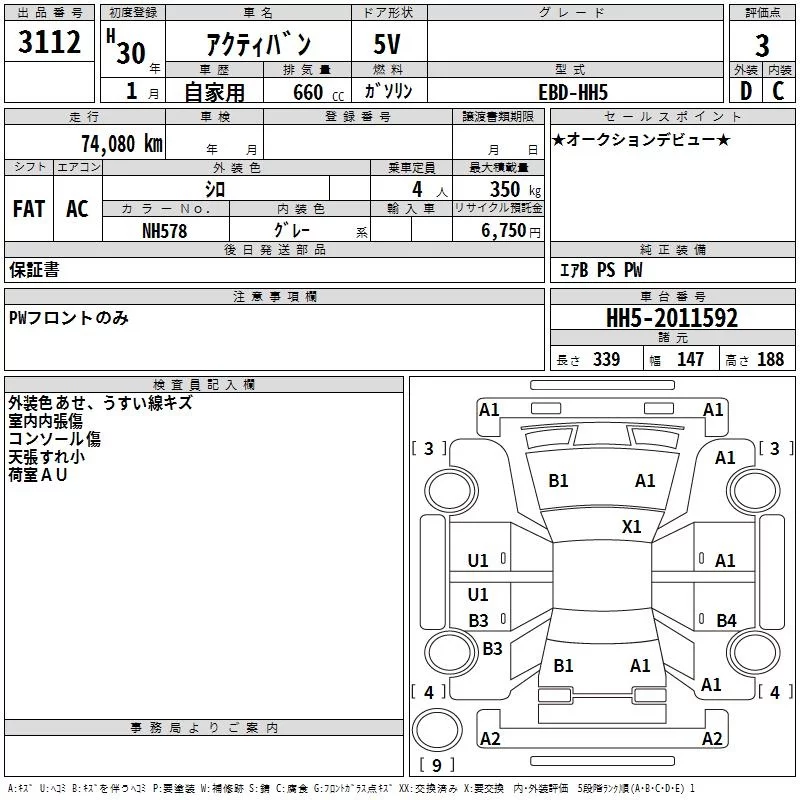 Honda ACTY VAN с аукциона Японии TAA Hyogo лот № 3112