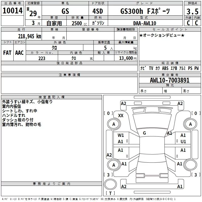 Lexus GS с аукциона Японии TAA Hyogo лот № 10014