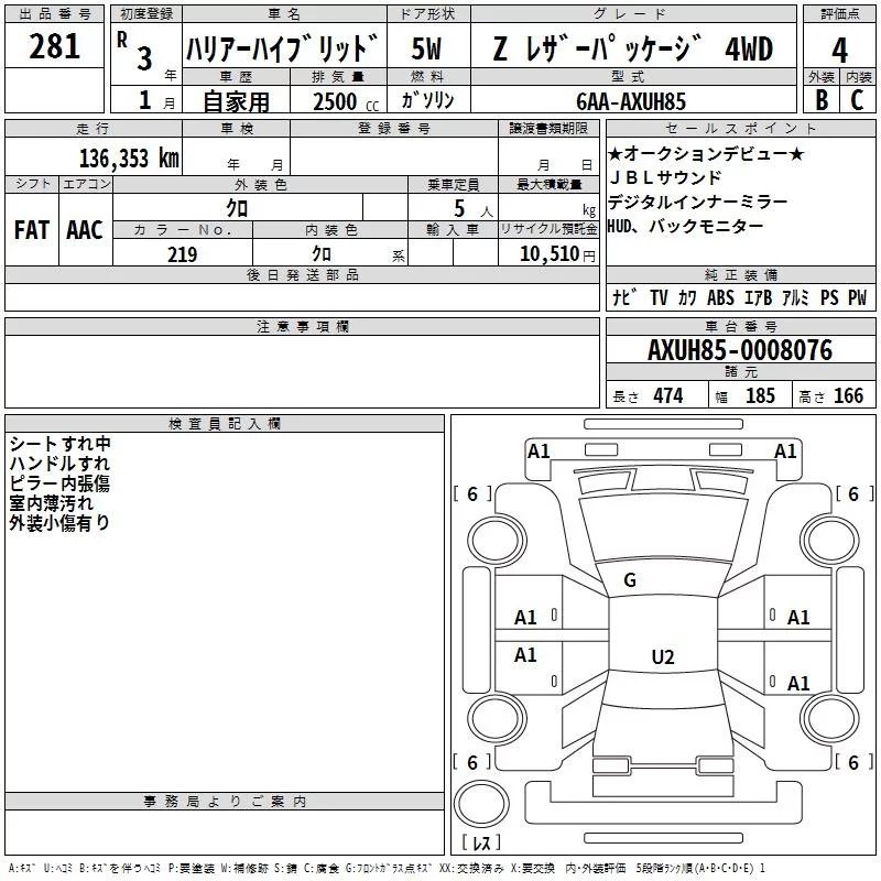 Toyota HARRIER с аукциона Японии TAA Hyogo лот № 281