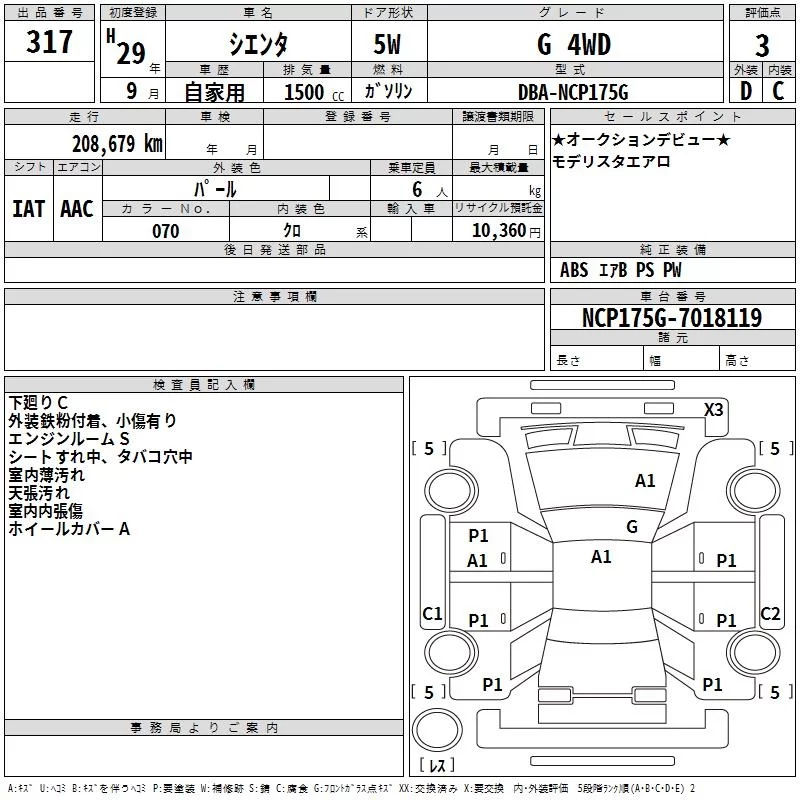 Toyota SIENTA с аукциона Японии TAA Hyogo лот № 317