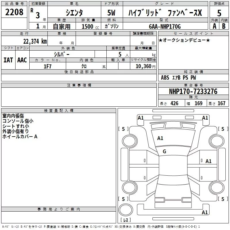 Toyota SIENTA с аукциона Японии TAA Hyogo лот № 2208